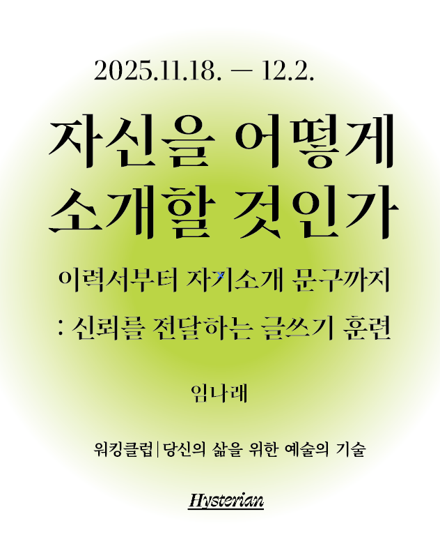 ✍️히스테리안이 마련한 새로운 브랜드 <워킹클럽>은 예술을 생산하고 소비하는 모든 시민들의 내면의 힘을 키우고 삶의 창조성을 연마하기 위한 프로그램을 제공합니다.