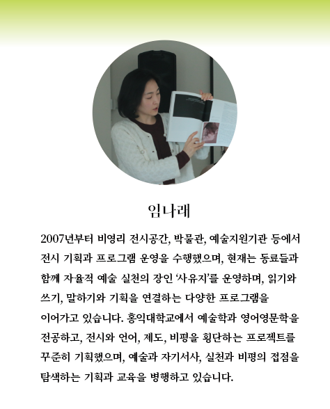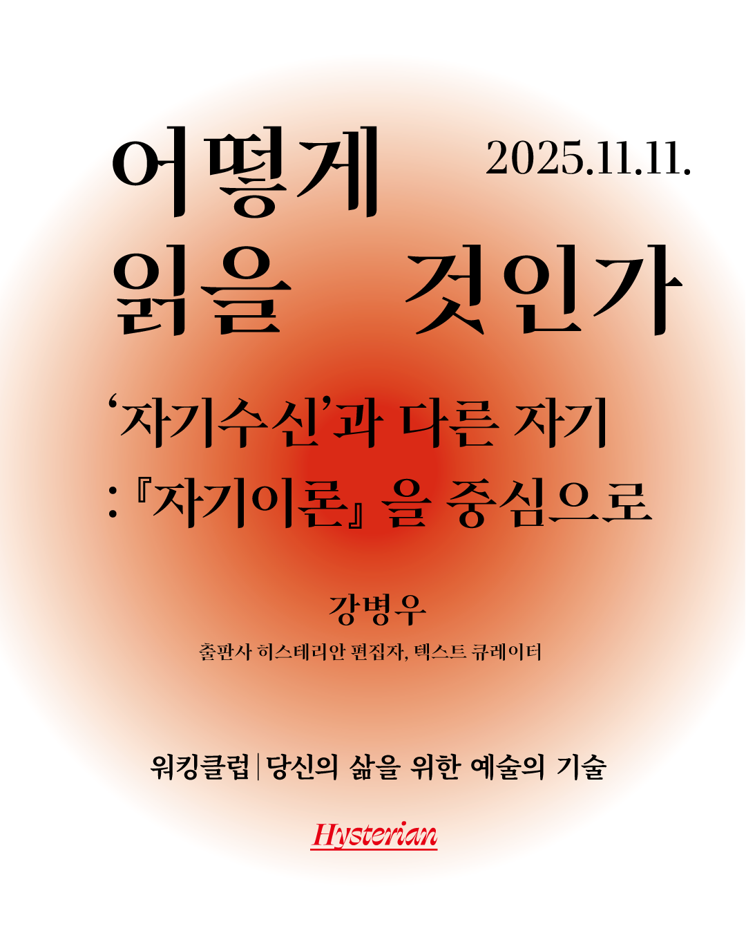 히스테리안의 연구 책임과 편집을 맡고 있는 민주님의 첫 책, 여러분 덕분에 초판 1쇄 제작에 큰 힘을 받았습니다. 정말 고맙습니다. 이 글은 그동안 히스테리안의 글쓰기 지향과 방향, 모든 것이라고 말할 수 있을 정도입니다. 그만큼 지금까지 출간되었던 히스테리안 책들의 색채를 민주님과 병우님이 만들어왔습니다. 두 분의 글은 작가님들의 예술 세계가 독자와 만날 수 있는 통로를 연결하거나, 맥락의 구체화를 높이기 위해 개념을 풀어내는 역할을 해왔습니다.