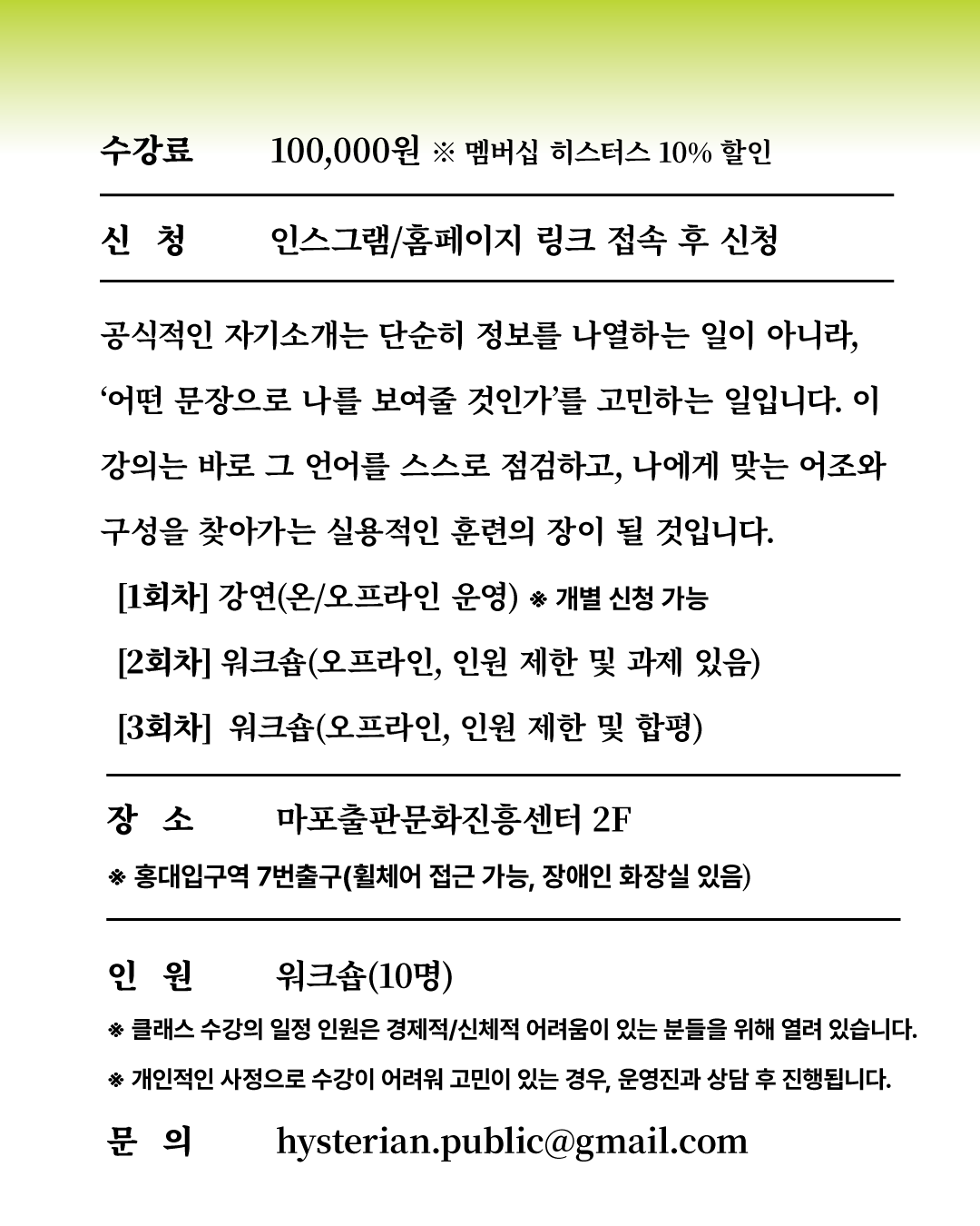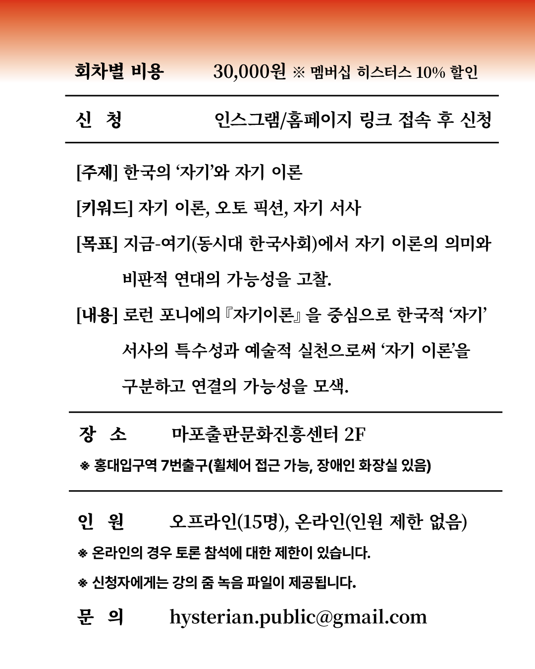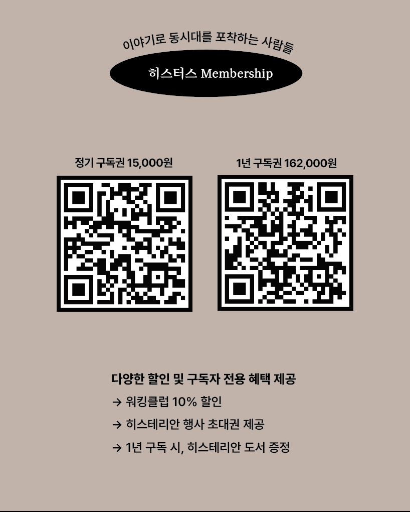 히스테리안은 멤버십 '히스터스'를 운영하여 읽고 쓰고, 영감을 공유하는 모임을 만들어가고 있습니다. 구독료는 히스테리안은 운영비와 함께 무언가를 만들어 갈 수 있는 플랫폼의 제반을 만드는데 사용하고 있습니다. 사이트 안에서 도서관/연구소/인쇄소를 운영하며 온/오프라인으로 모임을 확장하고 있습니다. 사이트는 지속적으로 이지윤 디자이너와 함께 개발중에 있구요. 편하고 가독성 높게 접근할 수 있도록 업데이트에 노력하고 있습니다. 그리고 모든 결제 시스템을 사이트 내로 진행하여 멤버십 할인 혜택과 적립금 사용까지 확장하려 합니다. 멤버십에 관심이 있으시다면 아래 문의주세요! 그리고 매월 마지막 달은 히스터스 데이로 멤버십을 가입하지 않더라도 참여할 수 있게 합니다. 궁금한 부분이 있다면 오프라인 모임에도 참여해주세요 :) 감사합니다! |
