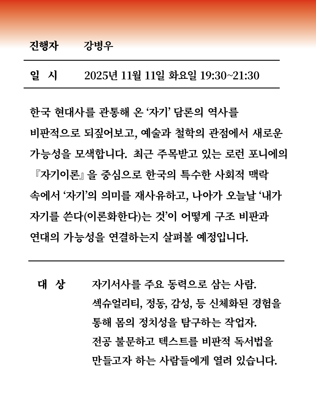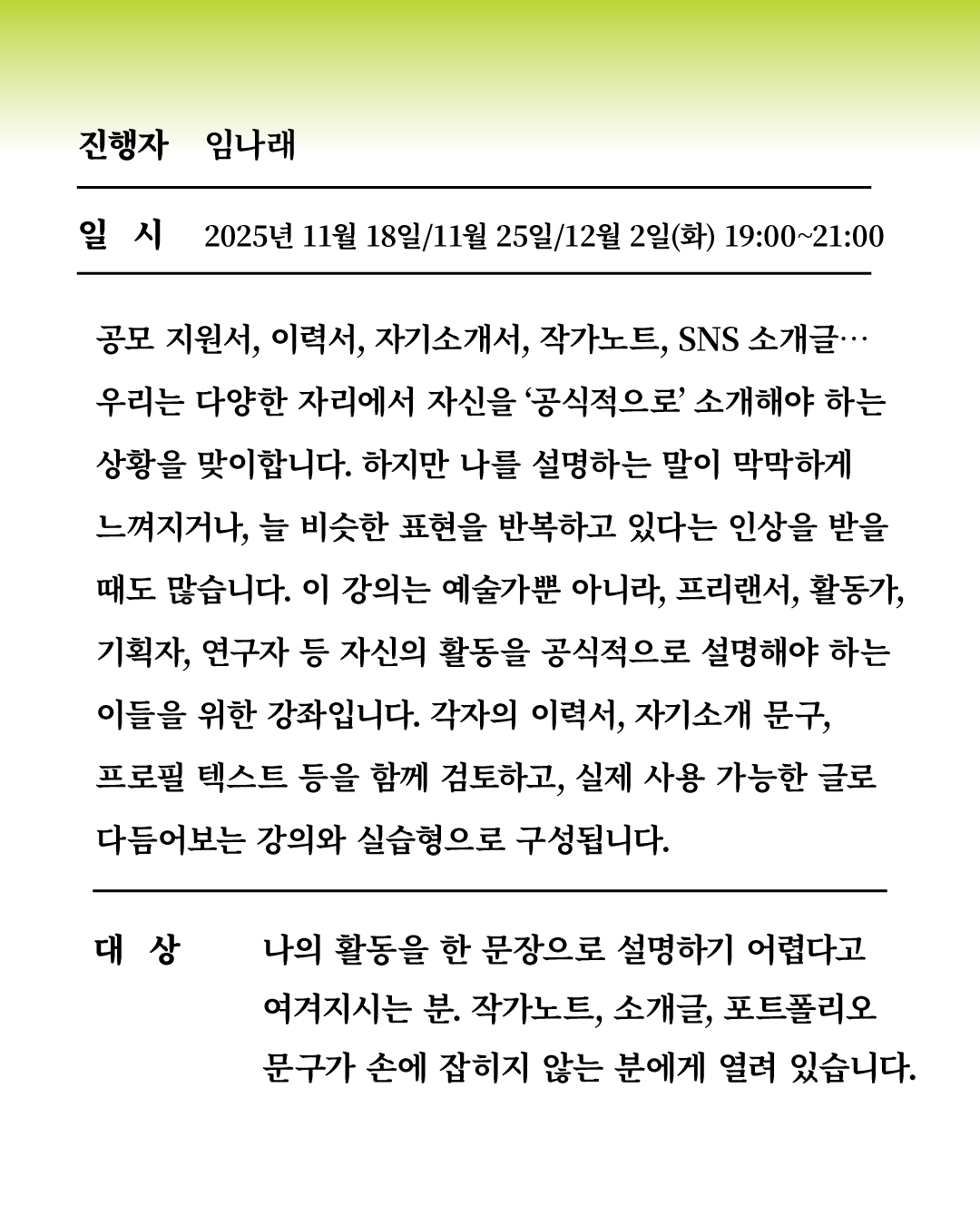 11월 워킹클럽 커리큘럼을 소개합니다. 바로 '쓰기'에 관해서인데요. 자기 자신을 어떻게 이론화 할 것인가에 대한 오토픽션, 자기서사에 대한 레퍼런스를 강병우 편집자가 진행할 예정이구요. (전 뉴스레터에서 ㅠ_ㅠ 링크 잘 못 보내드렸어요 죄송해요..ㅠㅠ) 그다음주는 임나래 큐레이터의 신뢰를 전달하는 글쓰기 훈련에 대한 3회차(강의와 실습)으로 구성됩니다! 최근, 여러 문화예술 기금으로 많은 서류들을 작성하셨을텐데요. 그 뿐만 아니라 사업 각종 정산까지 글쓰기는 작업의 시작과 끝인 것 같기도 합니다. 이번 글쓰기 강좌는 사실 올해 마무리와 내년를 염두해두고 구성했습니다. 쓰기의 우리의 무기가 되도록! 준비한 워킹클럽, 많관부 😉 |