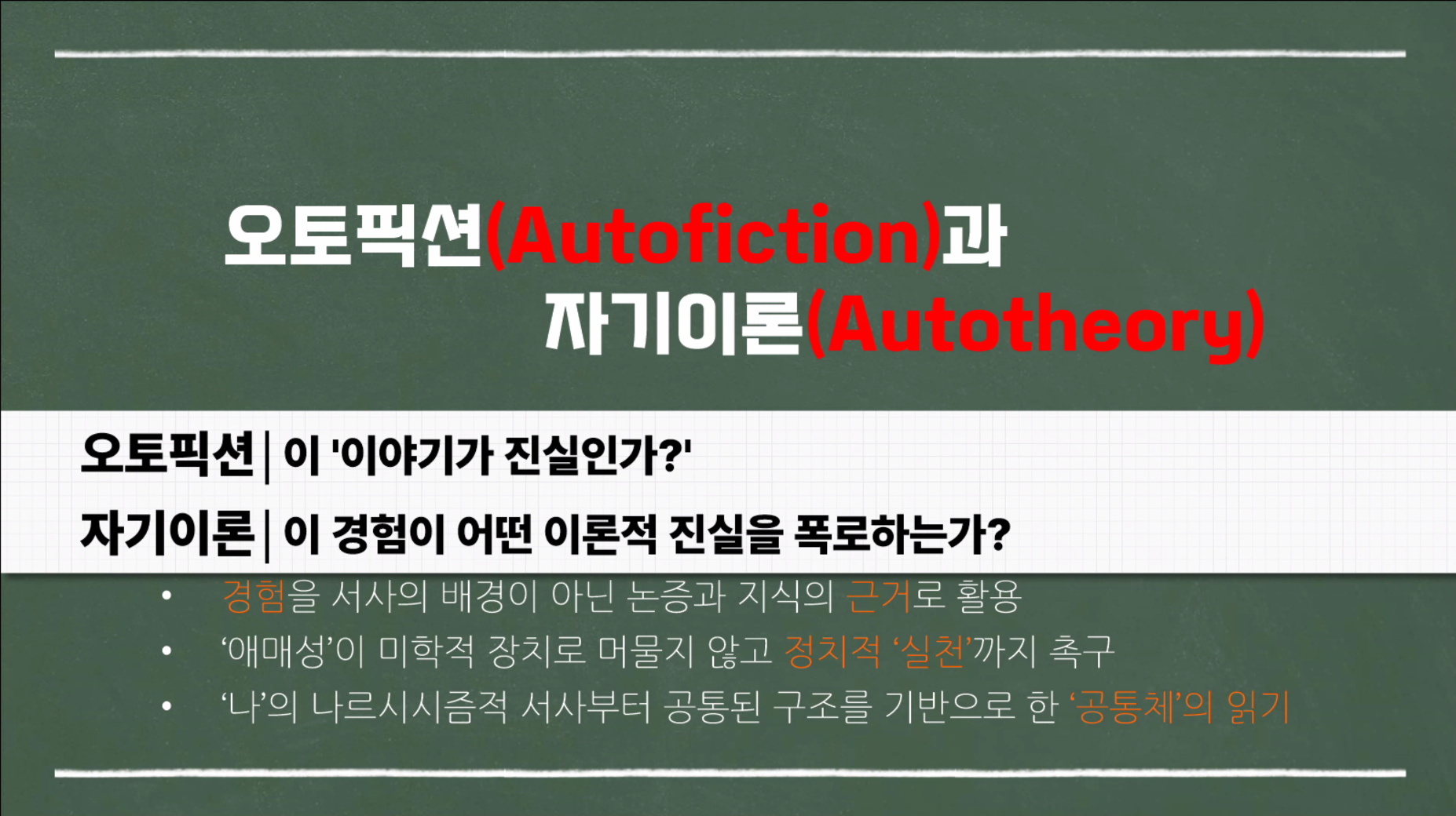 병우님의 워킹클럽은 로런 포니에의 '자기이론'을 중심으로 자기이론에 대한 이야기였지만, 강의는 자기이론과 오토픽션 사이를 경유한 한국형 '자기'를 감각하는 방향에서 로니에의 자기이론을 연결지었습니다. 오히려 포니에의 자기이론적 사유를 기반으로 오늘날 한국 사회에서 '자기이론'이 어떻게 구성되었는지에 대한 강의라 흥미로웠습니다. 오토픽션과 자기이론에서 주요하게 보는 것은 화자와 나가 일치하지 않는다는 사실입니다. 내가 그것에 대해 쓰지만 사실, 그것은 사실이 아닐 수도 있고 맞을 수도 있다는 것이지요. 화자를 '나'로 서술하였지만 '나'가 아닌 것이며 '나'가 아닌 것이 쓰는 이야기, 즉 인물과 관계로 맺는 서사는 '나'의 이야기만은 아니라는 것이죠. 이와 더불어 자기 이론은 어떤 것이 문제적이고 이론적/경험적 - 문제의식을 품고 있고 있느냐로 더욱 날카롭게 접근할 수 있다는 점이었습니다. 이러한 문제를 경유하여, 한국형 '자기'의 생성 과정에서 헤르만 헤세의 '데미안'과 더불어 전혜린의 사색하는 '여성'으로 잇는 관점이 이번 워킹클럽의 주요한 포인트였던 것 같아요! 그럼, 또 재미난 이야기로 만나요~