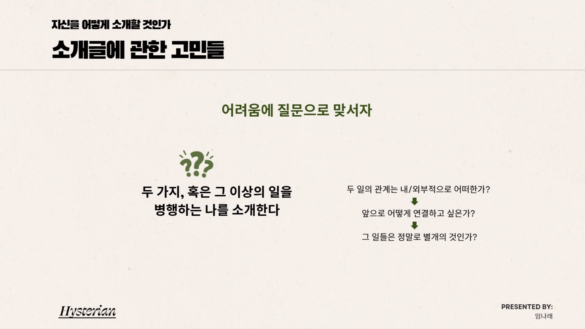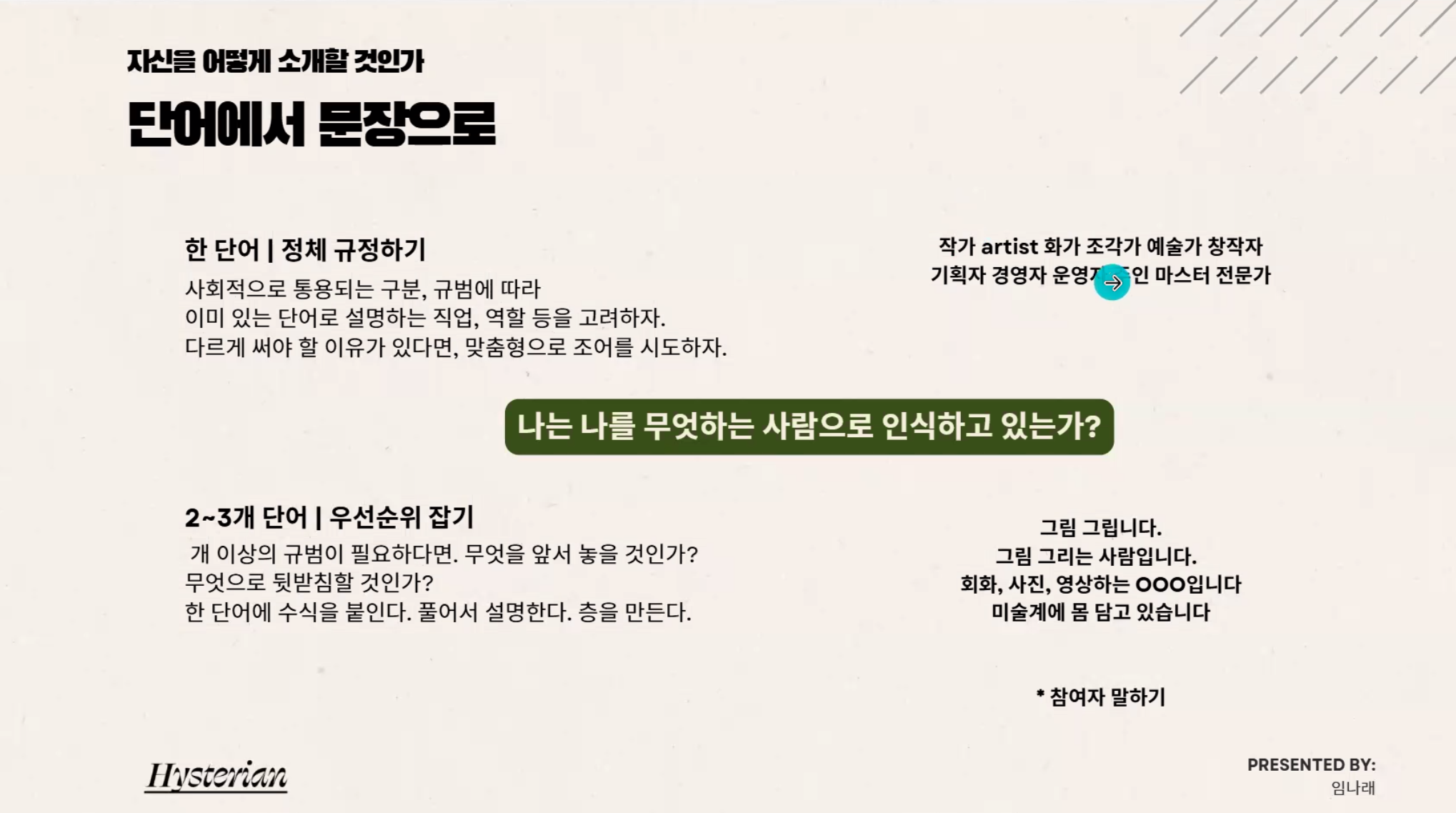 임나래 큐레이터님의 강의도 무사히 종료되었습니다. 예정된 3회는 아니었지만 3회같은 1회로 강의를 진행해주셔서 정말 감사했어요..! 그리고 성심껏 참여자들 프로필을 짚어주면서 자기 자신에 대한 '설명'의 포인트를 엿볼 수 있게 되었어요. 자기 스스로를 분석하는 것에 한계가 있을 수밖에 없고, 나누고 공유할수록 자기만의 고유한 짙은 색채가 생기는 것 같았습니다. 끊임없이 자기증명을 요구받는 시대에, 어떤 맥락과 상황에서 나 자신을 소개할 것인가의 문제에는 언제나 어려움을 따릅니다. 이러한 증명에서 중요한 포인트는 나를 설명하는 것이 아니라, 상대방이 어떤 것을 듣고 싶어하는지와 나 사이의 간극을 조율하는 일 같다는 생각을 했습니다. 상대가 듣는 위치와 상태를 고려하여 나를 설명하는 일, 그리고 내가 가진 추상의 세계를 이미지로 그려 단어로 안착하는 방법에 대한 실질적인 면 또한 고민할 수 있었습니다. 이번 참가자들은 모두 시각예술가로 구성된 작가들이라, 증명에 대한 피로감을 공감할 수 있엇는데요. 그래도 앞으로 다가올 증명 '마감'을 즐길 수 있는 하나의 시간이 되었길 바라며, 또 종종 뵙겠습니다!
