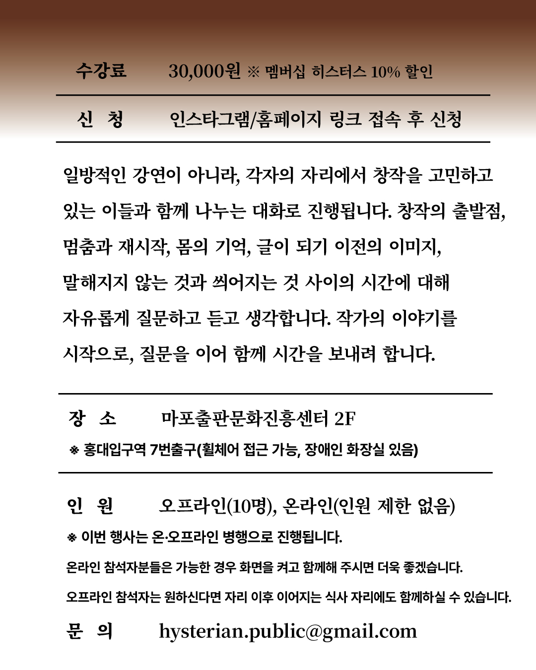 ✍️히스테리안이 마련한 새로운 브랜드 <워킹클럽>은 예술을 생산하고 소비하는 모든 시민들의 내면의 힘을 키우고 삶의 창조성을 연마하기 위한 프로그램을 제공합니다. |