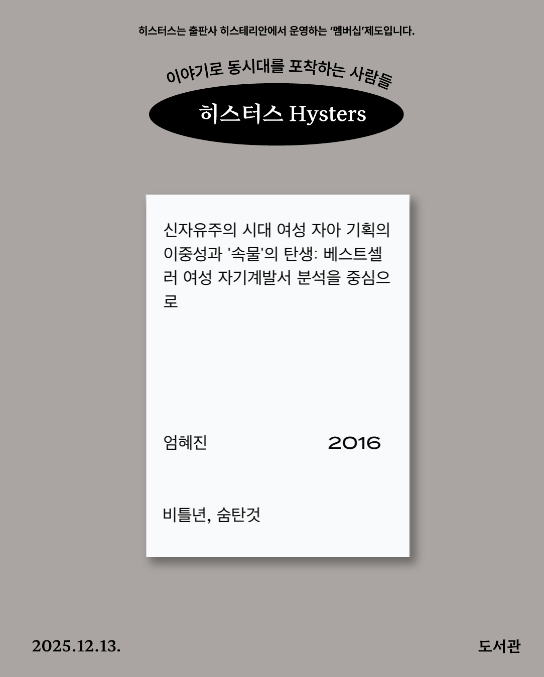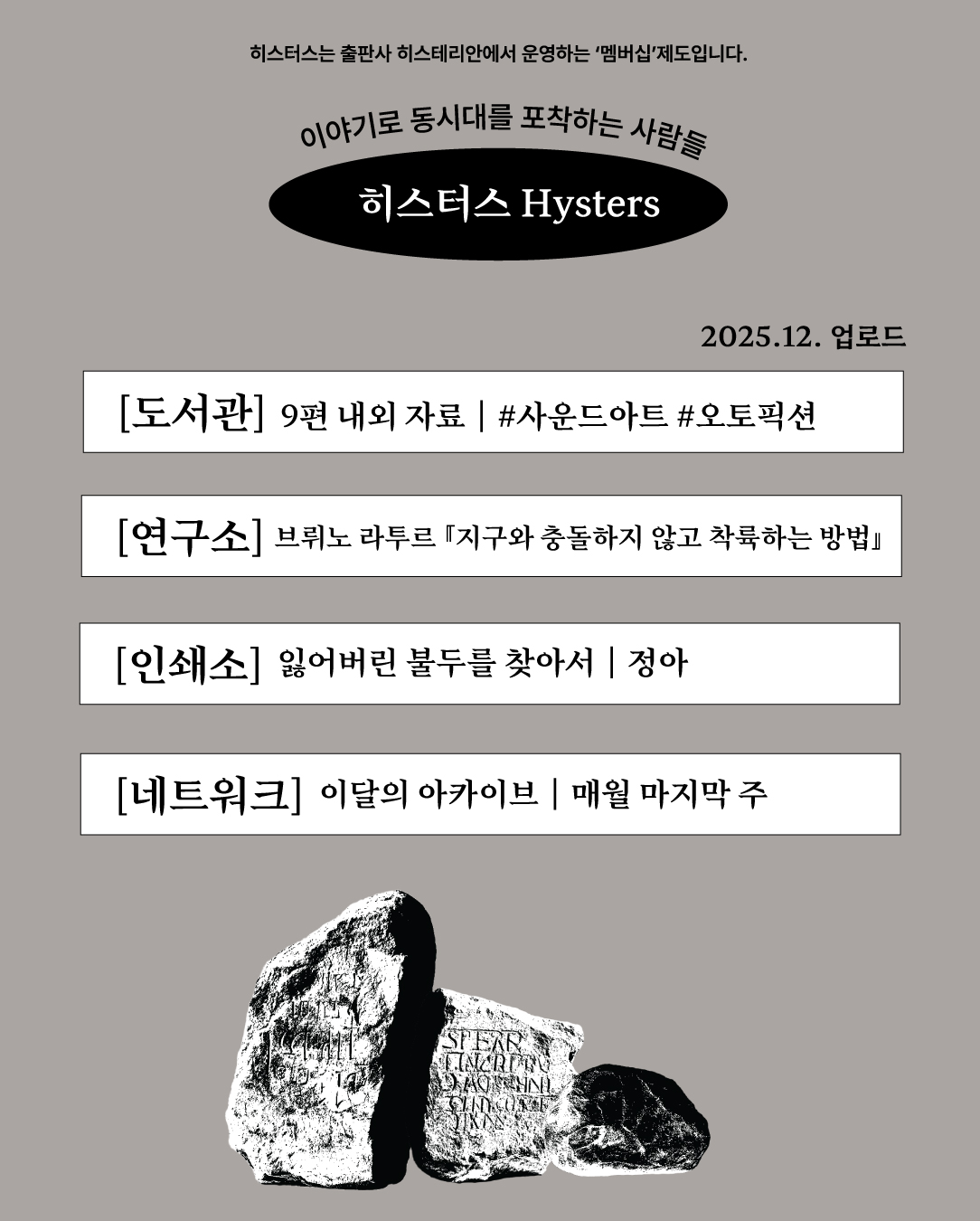 작년 11월부터 뉴스레터를 시작했는데, 18편의 에피소드를 메일로 보냈어요. 정말 많은 일이 있었습니다. 뉴스레터를 통해 소식지를 발송하는 것과 더불어, 예술가의 기술을 소개하는 '워킹클럽' 프로그램을 개설하고, 출판사로서의 확장 모두 중요했습니다. 정신없이 우당탕탕했고, 뉴스레터에서 오탈자와 링크 오류 등 여러 실수가 많아 자괴감이 들었지만😂 주변에서 재밌게 읽고 있다고 하여, 기쁜 마음이 컸습니다. 또, 이 과정이 재밌게 된 이유는 좋은 동료들을 만난 것도 큰 이유가 됩니다. 그 만남에 큰 비중에는 리서치클럽 '멤버들'이 있었는데요. 작년, 히스테리안의 시각 연구 주제어 '숨은O'을 리서치하기 위해 오픈콜을 열었어요. 예상보다 많은 분들이 지원해 주셨고, 그 중 함께해 주신 멤버분들이 저희에게 큰 힘과 사랑이 되어 주었습니다. 손에 잡히지 않는 허황된 이야기의 실체를 찾기 위한 여정은 험난했지만, 동료들 덕분에 이어올 수 있었고, 그 이야기를 매개하여 충남 서천에서 <둔주: 그림자가 된 전통>(~12/20)을 기획하였고, <히스터스> 멤버십을 만들 수 있는 용기를 얻었습니다.