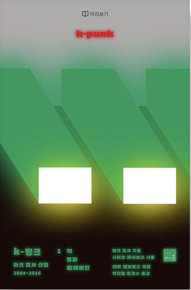 『k-펑크』 1권은 밸러드, 버로스, 크로넨버그, 70~80년대 모더니즘 방송 체제, 『샤이닝』과 『배트맨』과 『헝거 게임』 등 책과 영화, 텔레비전에서 피셔가 채굴한 가능성의 조각들을 담고 있다. 이 책에 수록된 글을 읽으며 우리는 불안과 권태가 공존하는 현실에 구멍을 내고자 한 어느 명민한 정신이 사고의 건축물을 쌓아 올린 과정을 들여다보게 된다. 날카로우면서도 정서적이고, 도발적이면서도 관대한 피셔의 비평은 읽기의 기쁨을 선사할 뿐 아니라 우리 자신의 현실을 진단하고 현재의 시야에 들어오지 않는 다른 미래를 꿈꾸라고 부추긴다.