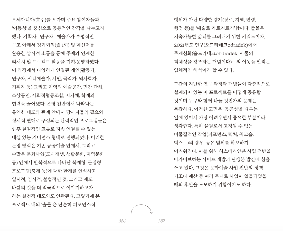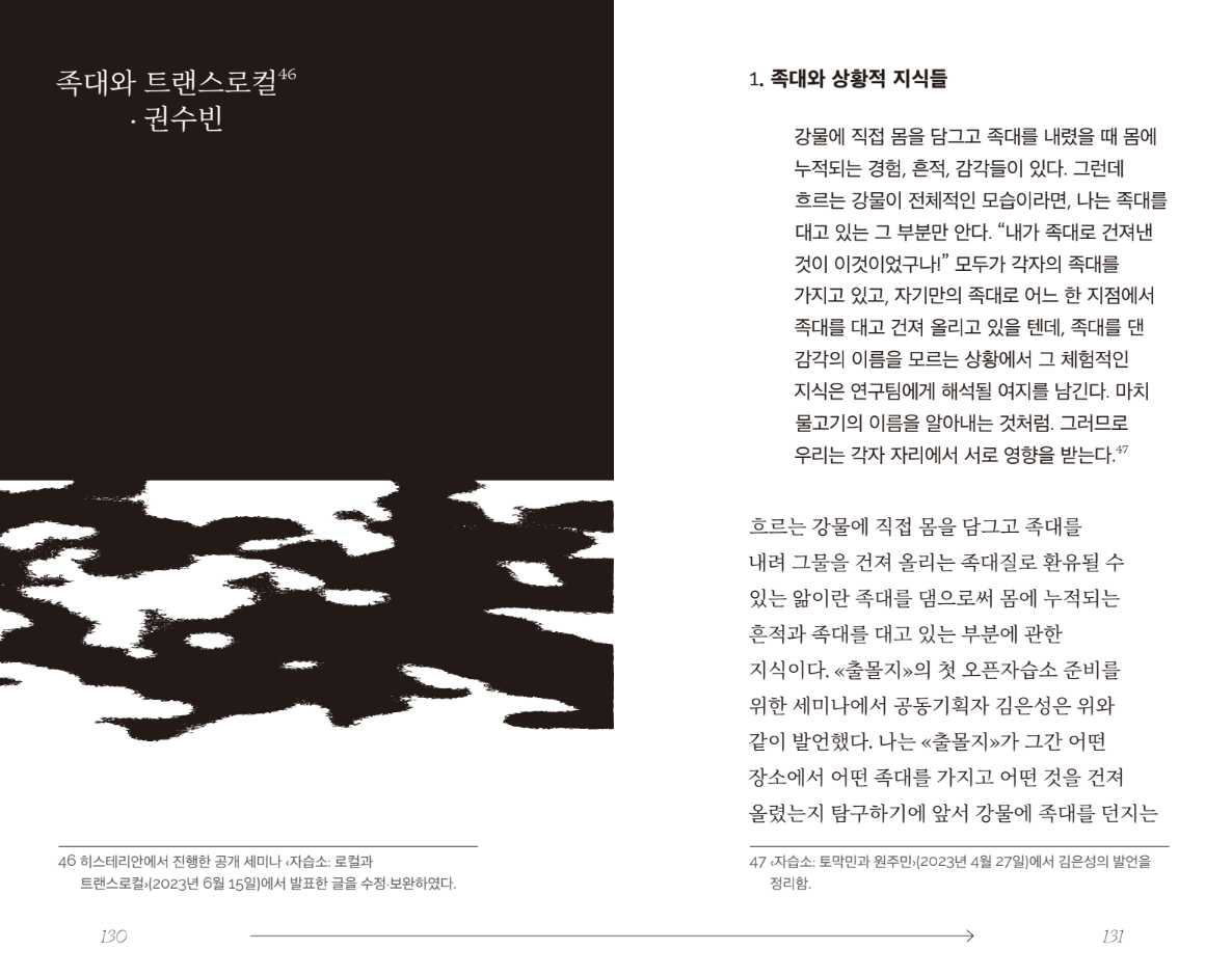 전남, 구례에 위치한 문화예술 공간 '호이요'를 아시나요? 전남 구례를 꼭 한 번 가보고 싶다 생각했었는데요. 지리산을 품은 구례에서 생태-예술-소리-접촉의 키워드로 운영 중인 '호이요'에서 재미난 일들이 벌어지고 있어요! 그리고 이 곳에서 지역과 소멸을 주제로 히스테리안의 <출몰과 커먼즈 예술론: 옵드라데크>(2024)에 필자로 참여해주신 권수빈 연구자의 강연이 열린다고 해요! 2이 책은 2022-2023년으로 진행한 공공예술 프로젝트를 통해 자본과 연류된 공간과 장소의 문제,지역 소멸로 분류되는 지역이 지닌 이야기, 수많은 문화사업에서 반복적으로 나타나고 있는 복제형 사업을 다르게 사유하기, 그에 따른 실험과 실패의 경험을 안겨준 프로젝트이기도 했습니다. 이 과정에 '족대'로 경험하기를 통해서만 알 수 있는 감각과 심상을 다룬 수빈 연구자의 이야기 ㅡ 많은 관심 부탁드립니다. * 소량으로 제작하여 유통사엔 절판된 상태입니다. *
