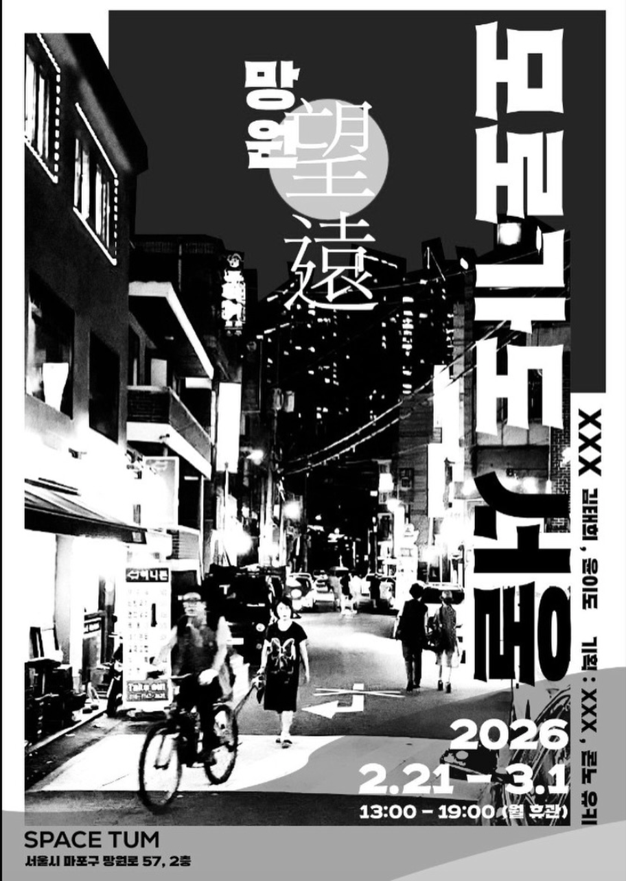 《모로가도 서울 : 망원》 2026.02.21 ~ 03.01. SPACE TUM (서울시 마포구 망원로 57, 2층) - 공식 소개글 - 망원동의 이름은 한강 변 망원정에서 유래했는데, 망원정은 한때 사신을 접대하던 풍광이 좋은 장소였으나 1925년 대홍수로 그 흔적을 잃었다. 오늘의 망원은 주거지와 상가, 새로운 건축물의 준공 등 여러 층위가 겹쳐진 채 변화의 시간을 지나고 있다. 본 전시는 동네의 일상적 면면과 거주민의 동선을 관찰한 자료를 바탕으로, 망원의 과거, 현재, 미래가 겹쳐진 시간을 전시장 안에 펼쳐 보인다. 관객은 전시장 곳곳에 놓인 망원의 단서를 수집한 뒤, 이를 출발점 삼아 직접 동네를 거닐며 각자의 방식으로 망원을 탐험하게 된다. |