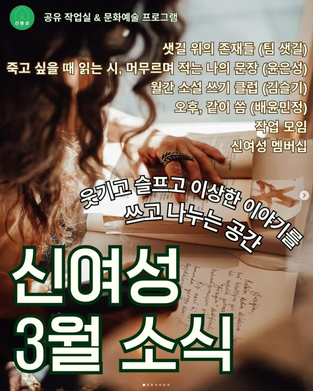 서울 마포구에 있는 '신여성'은 글쓰기 워크숍, 인문학 세미나 등 다양한 프로그램이 열리는 곳입니다. 읽고 쓰는 공간이라니, 취향묻은 공간이 부족해지고 있는 홍대앞에 신여성은 정말 반가운 공간인데요. 배윤민정 작가님이 운영하는 공간이기도 합니다. 📍 샛길 위의 존재들: 낙인, 불법화, 비범죄화 너머의 삶을 상상하기 (샛길) 📍 죽고 싶을 때 읽는 시, 머무르며 적는 나의 문장 (윤은성) 📍 월간 소설 쓰기 클럽 (김슬기) 📍 오후, 같이 씀 (배윤민정) 📍 작업 모임 📍 신여성 멤버십 |