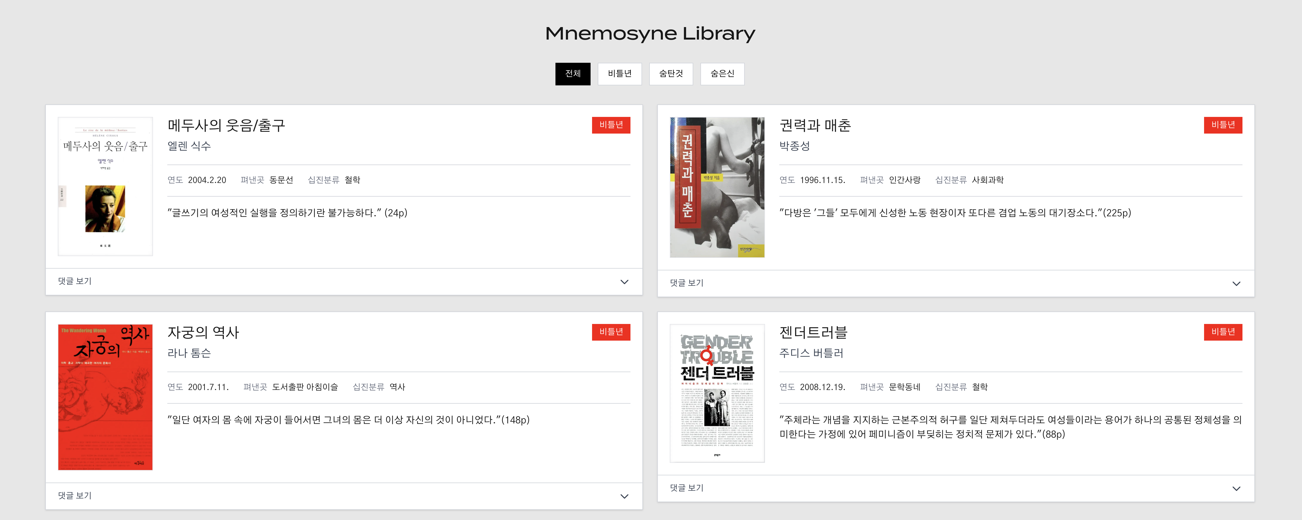 사이트 내에 도서카드처럼, 댓글과 댓글로 인용과 생각이 연결되는 그림을 생각했는데, 그리 참여가 원활하진 않은 것 같아요. 다양한 장소에서 실험하여 확장해볼께요! |